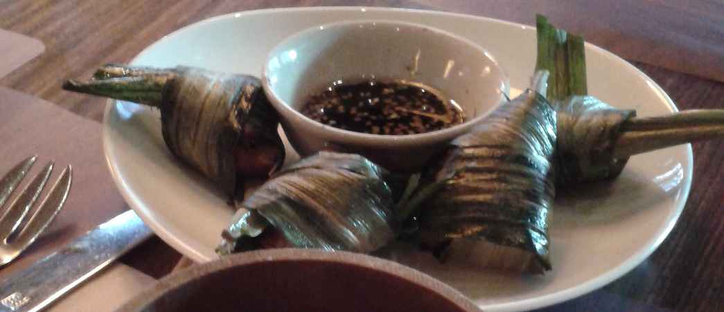 Anyway I passed a Thai restaurant and it looked so intriguing I wandered in and I was hungry. So I decided I had to have a snack..and ordered a tom yum and a guava collins to drink. I love tom yums – and this tasted good (not as hot as the ones I m accustomed to in Thailand) with the sea food freshness of the prawns. So good that I thought I’d have something else, I asked for the menu again and ordered a pandan chicken with sticky rice for accompaniment. In South east Asia, pandan leaves are used as a flavouring like vanilla to desserts and they are very fragrant. I loved the idea of chicken wrapped in pandan leaves and grilled. Unfortunately when it came I found the chicken over cooked and did not hold the promise at all. Very disappointing.